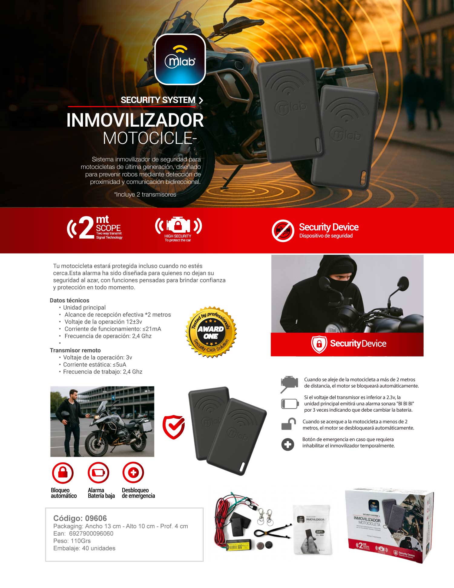 Sistema inmovilizador de seguridad para motocicletas de última generación, diseñado para prevenir robos mediante detección de proximidad y comunicación bidireccional. *Incluye 2 transmisores.