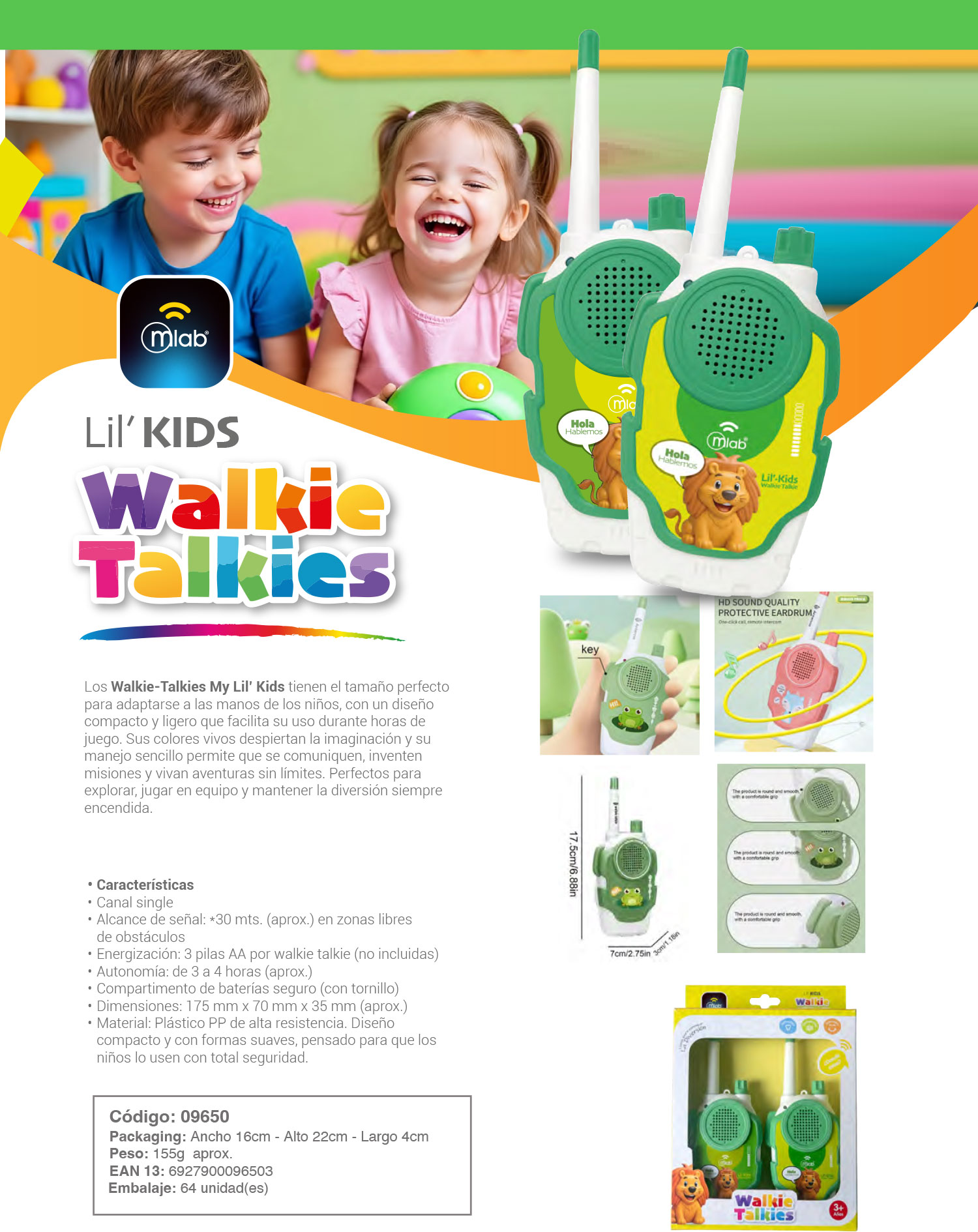 Los Walkie-Talkies My Lil’ Kids tienen el tamaño perfecto para adaptarse a las manos de los niños, con un diseño compacto y ligero que facilita su uso durante horas de juego. Sus colores vivos despiertan la imaginación y su manejo sencillo permite que se comuniquen, inventen misiones y vivan aventuras sin límites. Perfectos para explorar, jugar en equipo y mantener la diversión siempre encendida.
