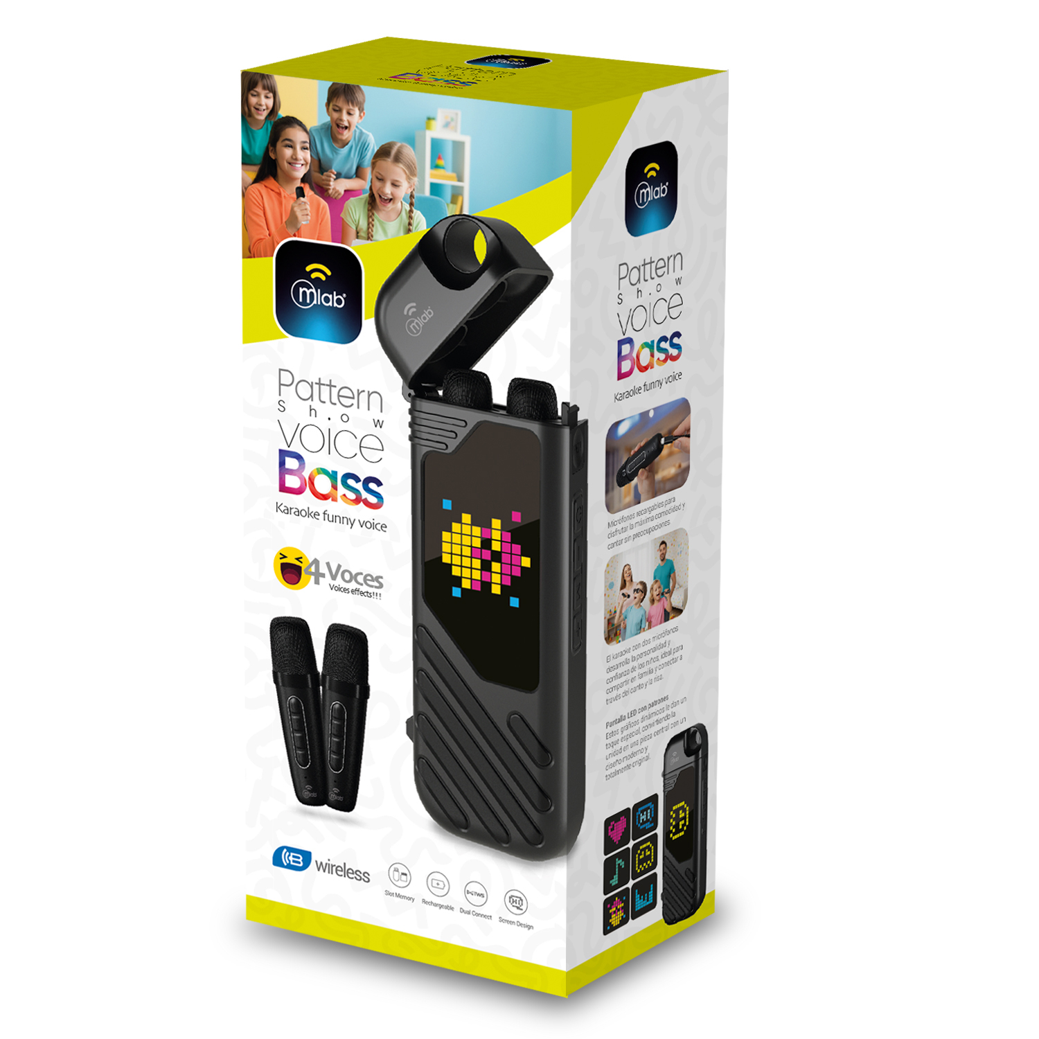 El parlante y sus micrófonos recargables ofrecen entretenimiento, con una pantalla iluminada con patrones dinámicos que ambienta cada momento y 4 efectos de voz que hacen cada experiencia aún más divertida.